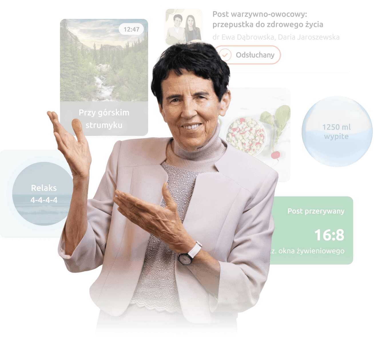 Odkryj zdrowotną moc spacerów i wzmacniaj efekty postu lub codziennej, zdrowiej diety. Funkcja Spacer to relaksacyjne ścieżki audio, które zmotywują Cię do codziennej dawki ruchu. Do tego pomogą Ci zebrać myśli, odprężyć się i zrelaksować. Z nimi zmienisz zwykły spacer we wzmacniający rytuał.