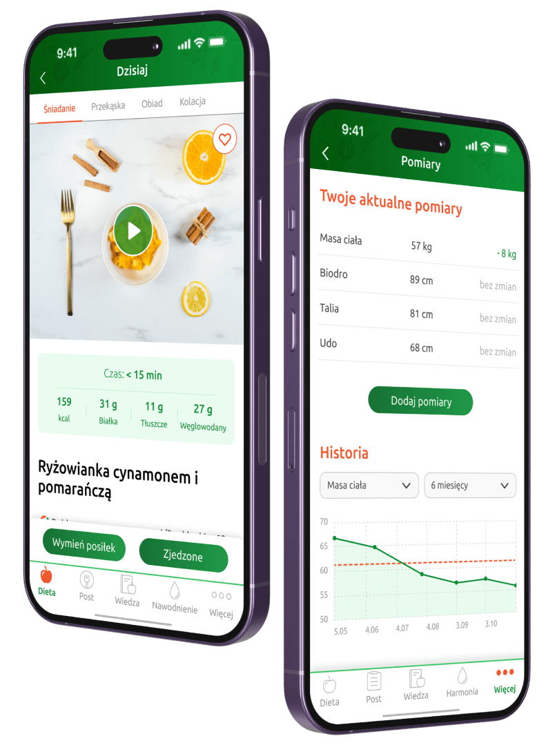 W aplikacji znajdziesz gotowe jadłospisy na każdy z tych etapów, ale także szereg funkcji, dzięki którym wprowadzisz nowe, zdrowe nawyki do swojej codzienności.